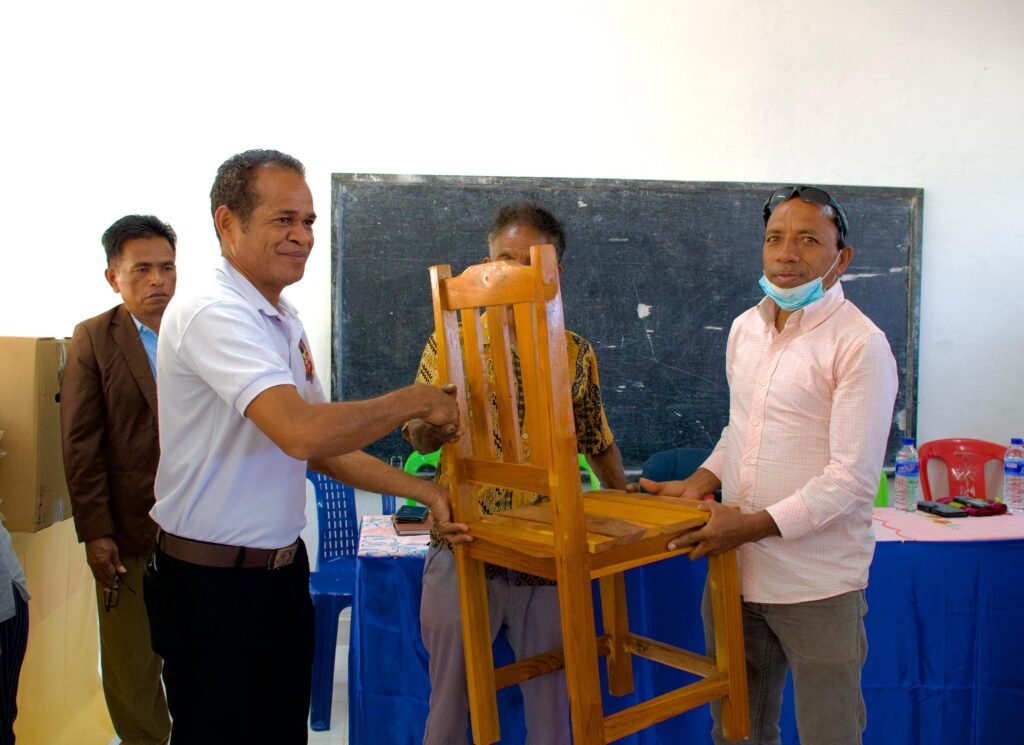 ne’e, ekipa Prezidénsia Repúblika transporta uluk Kadeira hamutuk 25, sei falta kadeira 75 no meza hamutuk 21, sei falta meza 79, totál meza-kadeira hamutuk 2000. Kuadru aprendizajem hamutuk 6, komputadór ho marka hp-1, printer ho marka hp 1 no ekipamentu desportu inklui sepatu-roupa. Apoiu ida ne’e parte husi inisiativa Prezidente J. Ramos-Horta nian, hodi responde ba proposta eskola refere. Parte ekipamentu desportu hetan donasaun husi Sr. Franklin, Prezidente nia belun di’ak iha Hong Kong.